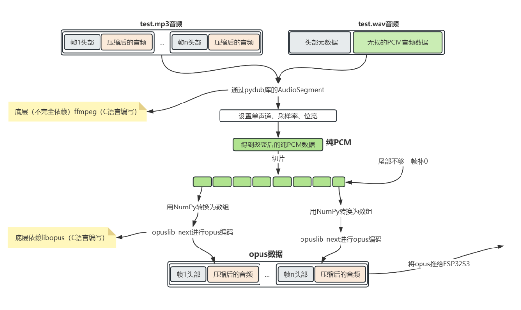 将 MP3/WAV 格式的音频,转换为 Opus 格式的压缩音频数据,并输出给 ESP32S3 设备使用