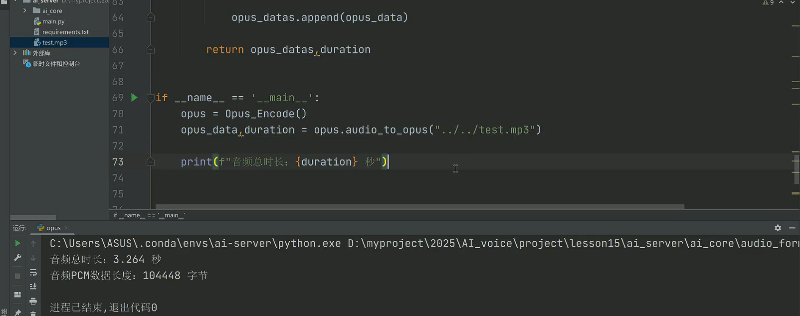 创建Opus_Encode类的实例,调用audio_to_opus方法,传入.../test.mp3这个音频文件路径,执行 "MP3 转 Opus 编码" 的流程;