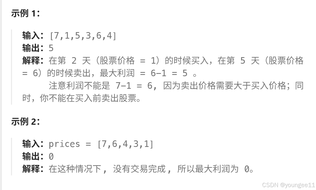 给定一个数组prices,它的第 i 个元素 prices[i]表示一支给定股票第 i 天的价格,只能选择某一天买入这只股票,并且选择未来某一个不同的日子卖出该股票,设计一个算法来计算所能获取的最大利润。返回最大利润,如果不能获取任何利润,返回0。