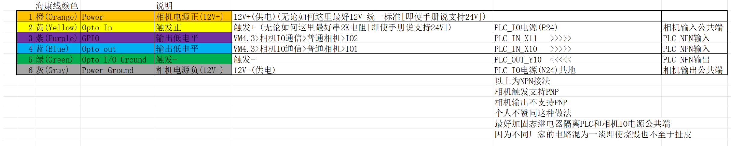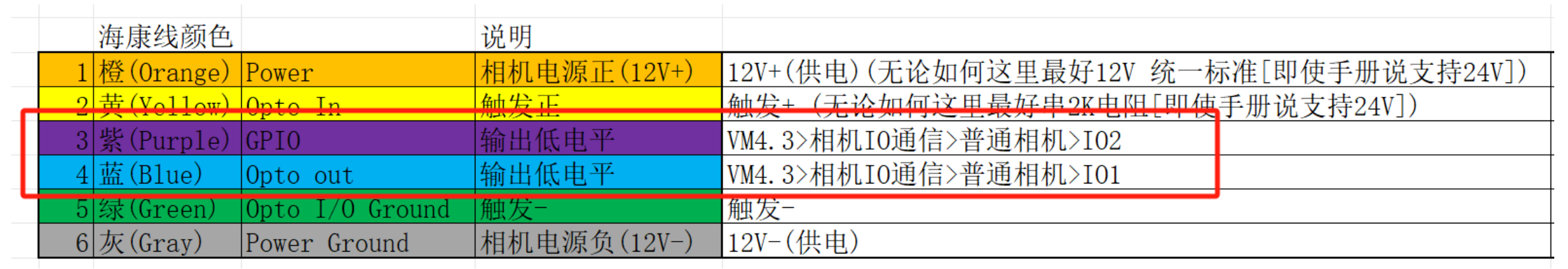 上面完整利用相机所有IO, 1个输入2个输出[虽然3号紫线为可配置输入输出但是在VM里面只能作为输出且没有光耦隔离!!!(很危险)].