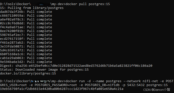 docker run -d --name postgres --network nifi-net -e POSTGRES_USER=admin -e POSTGRES_PASSWORD=admin -e POSTGRES_DB=admin -e PGDATA=/var/lib/postgresql/data/pgdata -v D:/Tools/Docker/PostgreSQL/pgdata:/var/lib/postgresql/data/pgdata -v D:/Tools/Docker/PostgreSQL/conf:/etc/postgresql -p 5432:5432 postgres:15
