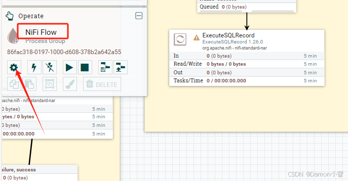 NiFi 首页,点击画布,左侧 NiFi-Flow 点击设置(齿轮按钮)。