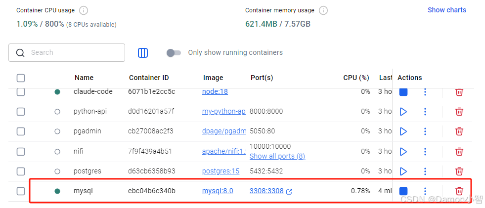 启动成功后,在 Docker Desktop 中也能看到运行中的 MySQL 容器: