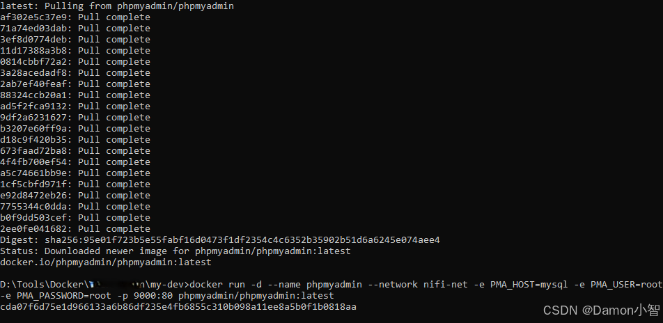 docker run -d --name phpmyadmin --network nifi-net -e PMA_HOST=mysql -e PMA_USER=root -e PMA_PASSWORD=root -p 9000:80 phpmyadmin/phpmyadmin:latest