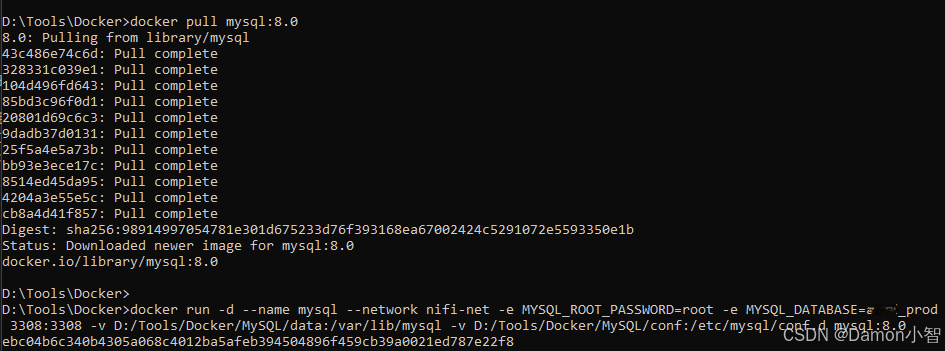 docker run -d --name mysql --network nifi-net -e MYSQL_ROOT_PASSWORD=root -e MYSQL_DATABASE=admin -p 3306:3306 -v D:/Tools/Docker/MySQL/data:/var/lib/mysql -v D:/Tools/Docker/MySQL/conf:/etc/mysql/conf.d mysql:8.0