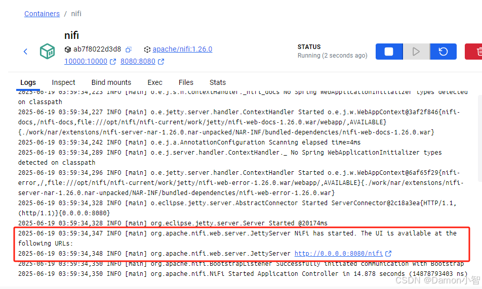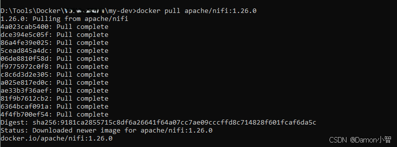 docker run -d --name nifi -e TZ="Asia/Shanghai" --network nifi-net --privileged=true -e SINGLE_USER_CREDENTIALS_USERNAME=admin -e SINGLE_USER_CREDENTIALS_PASSWORD=nifi1357924680 -e NIFI_WEB_HTTP_HOST=0.0.0.0 -e NIFI_WEB_HTTP_PORT=8080 -e NIFI_REMOTE_INPUT_SOCKET_PORT=10000 -p 8080:8080 -p 10000:10000 -p 9090:9090 -p 9091:9091 -p 9092:9092 -p 9093:9093 -p 9094:9094 -p 9095:9095 -v D:/Tools/Docker/nifi/conf:/opt/nifi/nifi-current/conf -v D:/Tools/Docker/nifi/database_repository:/opt/nifi/nifi-current/database_repository -v D:/Tools/Docker/nifi/flowfile_repository:/opt/nifi/nifi-current/flowfile_repository -v D:/Tools/Docker/nifi/content_repository:/opt/nifi/nifi-current/content_repository -v D:/Tools/Docker/nifi/provenance_repository:/opt/nifi/nifi-current/provenance_repository -v D:/Tools/Docker/nifi/logs:/opt/nifi/nifi-current/logs -v D:/Tools/Docker/my-dev/drivers/postgresql-42.6.2.jar:/opt/nifi/nifi-current/lib/postgresql-42.6.2.jar -v D:/Tools/Docker/my-dev/drivers/mysql-connector-j-9.3.0.jar:/opt/nifi/nifi-current/lib/mysql-connector-j-9.3.0.jar apache/nifi:1.26.0