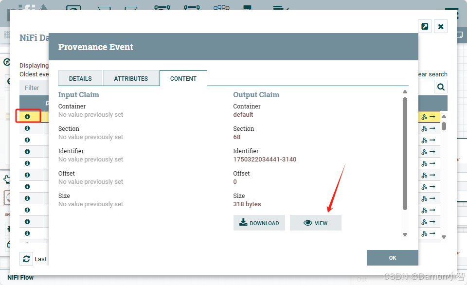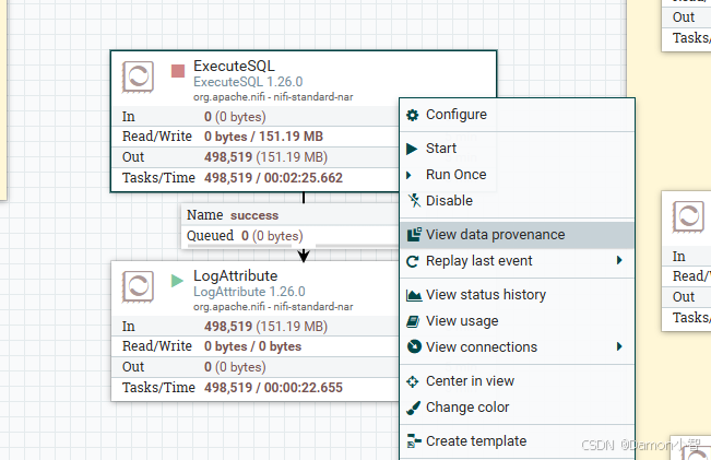 有成功运行的记录之后,右键 ExecuteSQL 点击 View data provenance 查看调用记录。