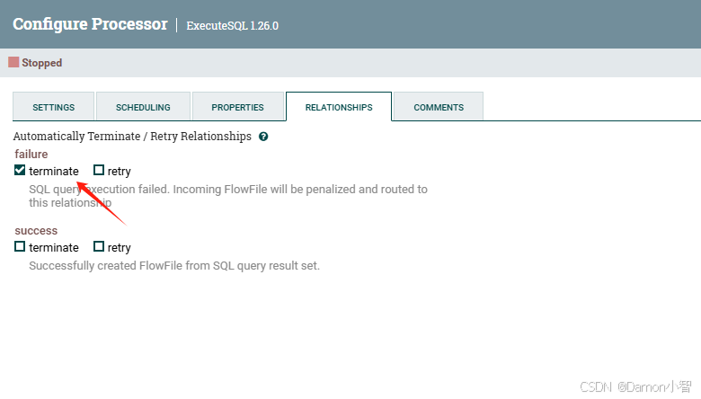 - Automatically Terminate/Retry Relationships 的 failure 事件选择