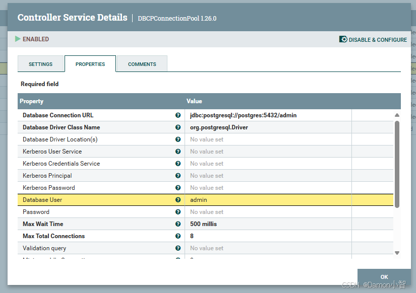 在 Controller Service 里创建的 DBCPConnectionPool,填写必要的信息: