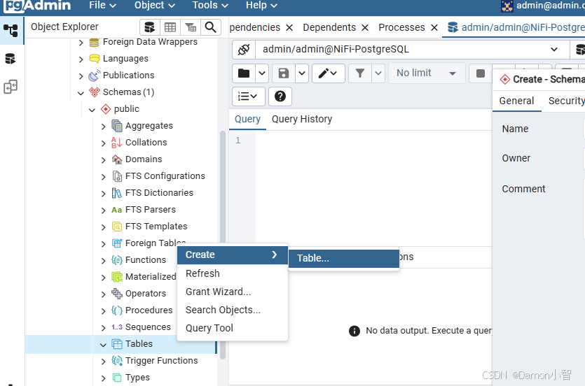 展开 Databases → 选中 admin → Schemas,右键 Tables → Create → Table。