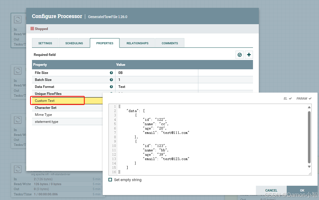 在 GenerateFlowFile 里编写测试数据源JSON: