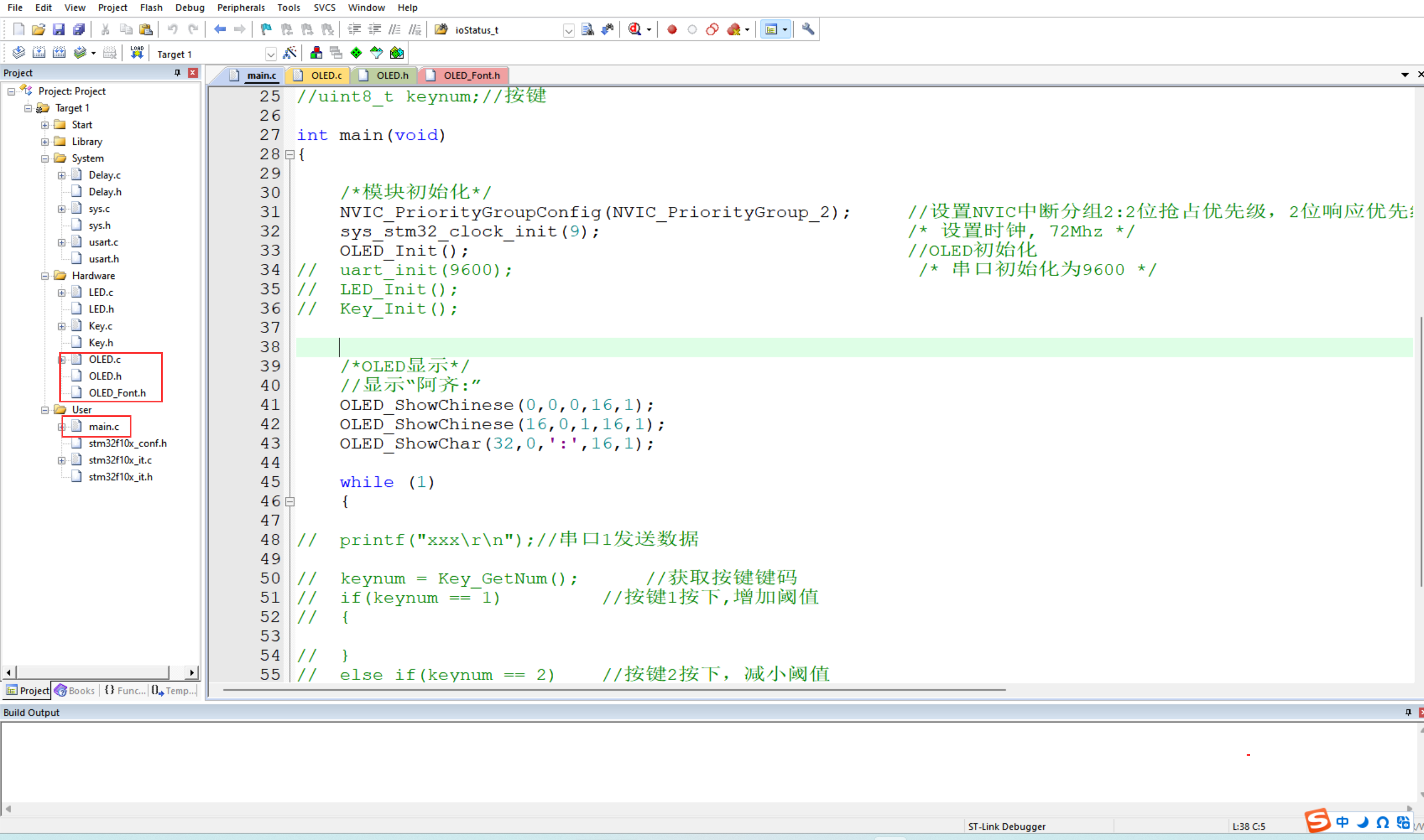 显示内容控制 :初始化完成后,主程序通过调用 OLED 显示函数,将指定的字符或汉字数据显示在 OLED 屏幕上。显示的数据来源于 OLED_Font.h 中定义的字模数组。