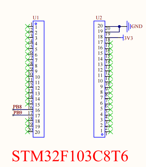 如下为STM32F103C8T6最小系统板用到的接线,使用PB8和PB9与OLED显示屏进行接线。电源接3.3v和GND共地。