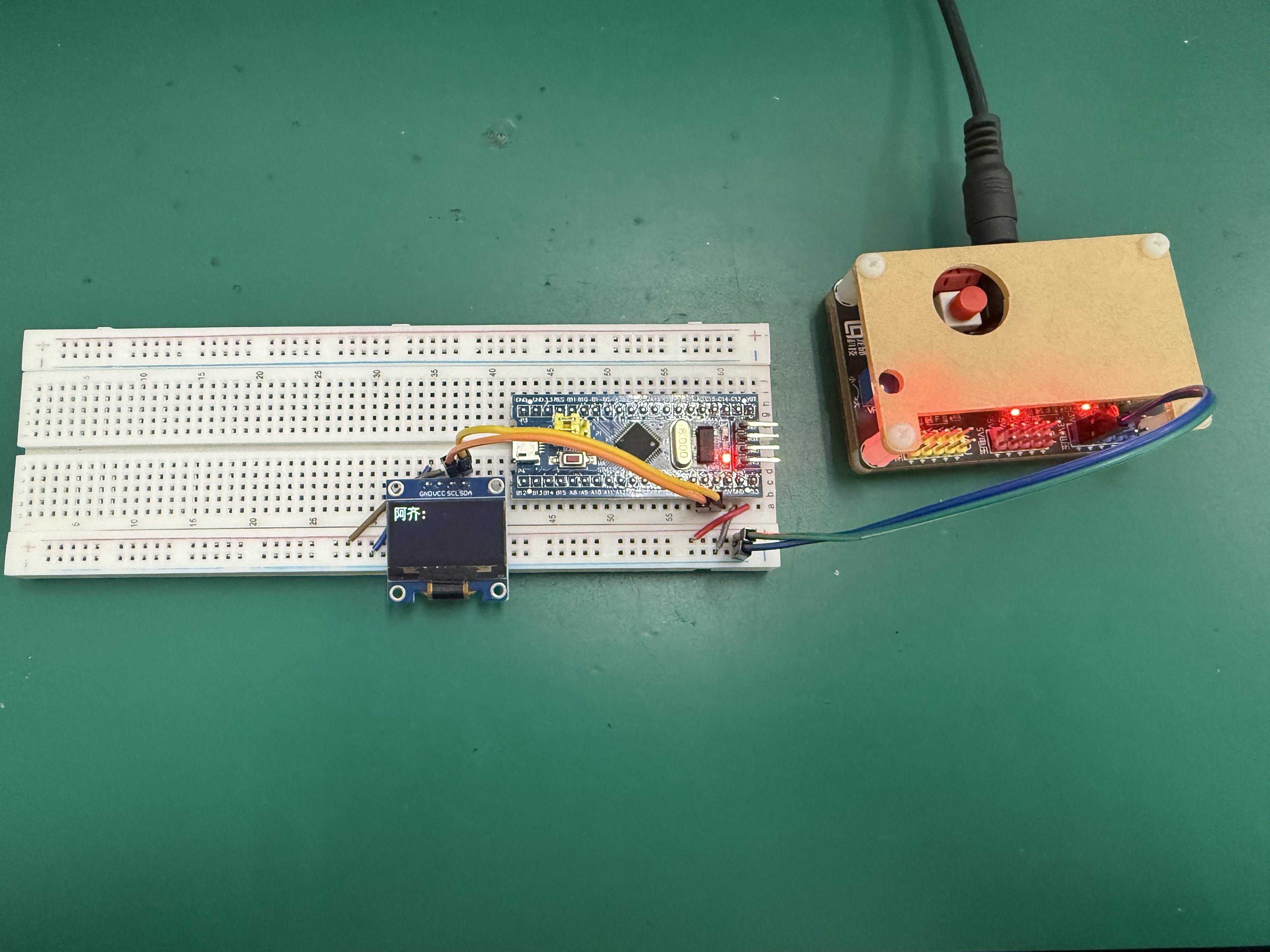 电源模块用两根杜邦线引出3.3V和GND到洞洞板,然后用飞线将STM32F103C8T6最小系统板和OLED显示屏的3V3和GND引脚接到电源输入处。