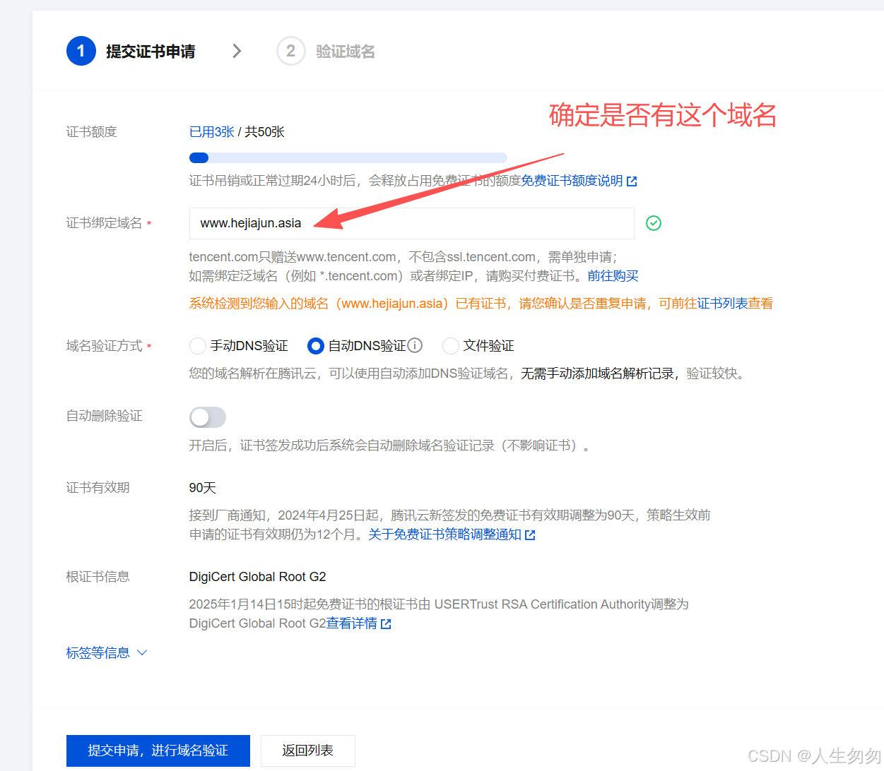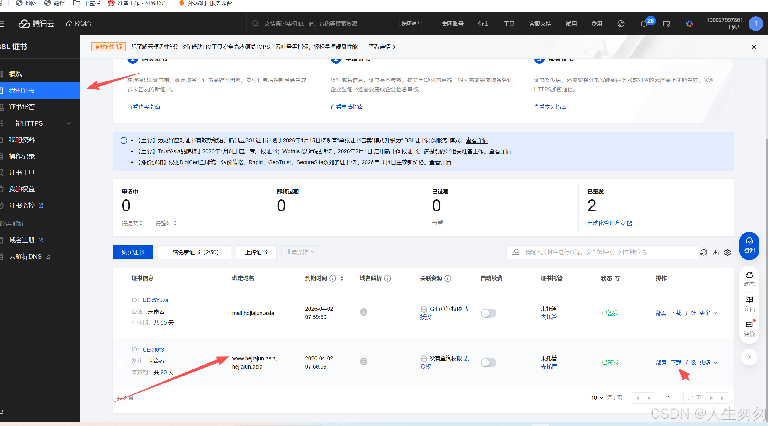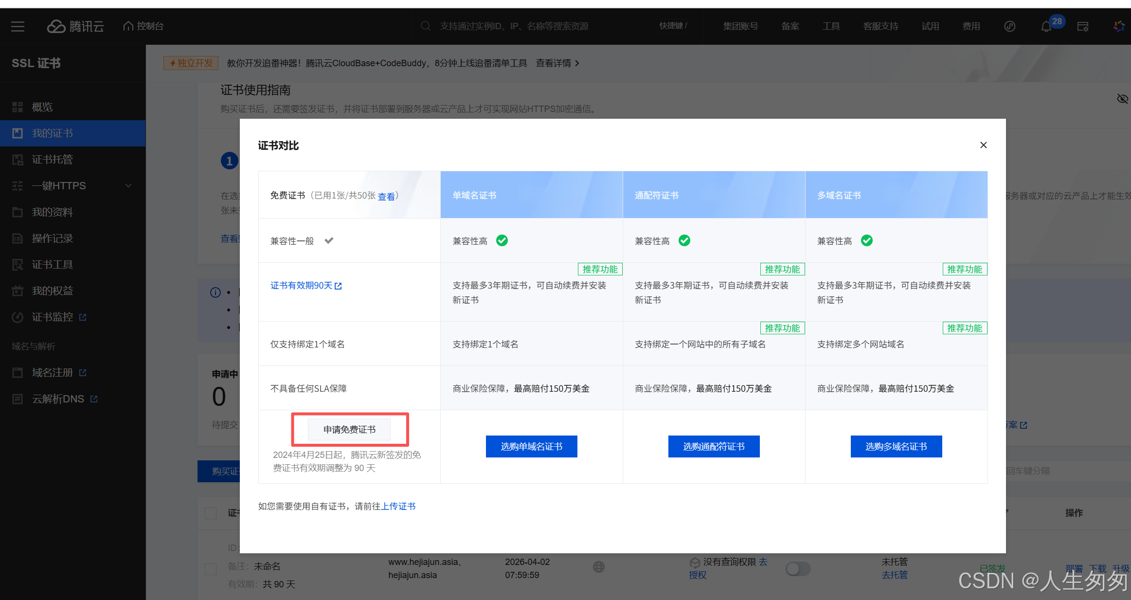 登录 SSL 证书控制台,进入我的证书页面,并单击申请免费证书。