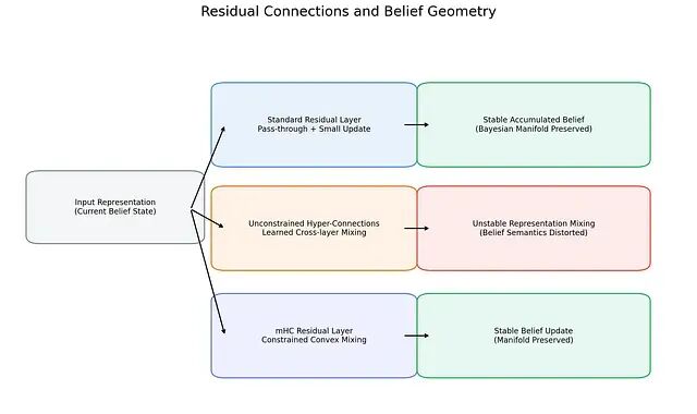 从贝叶斯几何角度审视,mHC的价值不仅在于稳定训练,它保护的是信念更新的内部语义。