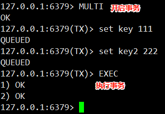 开启⼀个事务. 执⾏成功返回 OK.