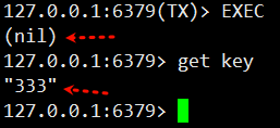 执⾏ EXEC 的时候, 客⼾端才会真正把上述操作发送给服务器,执行队列中的操作。