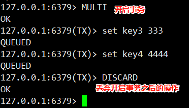 放弃当前事务。 此时直接清空事务队列。 之前的操作都不会真正执⾏到。