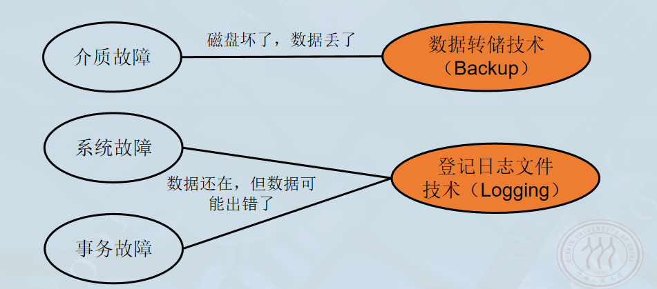 - 软件错误: DBMS自身bug、操作系统崩溃。