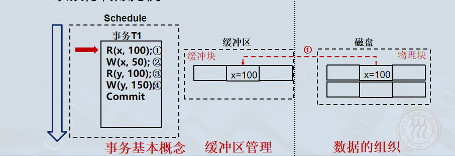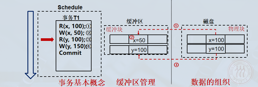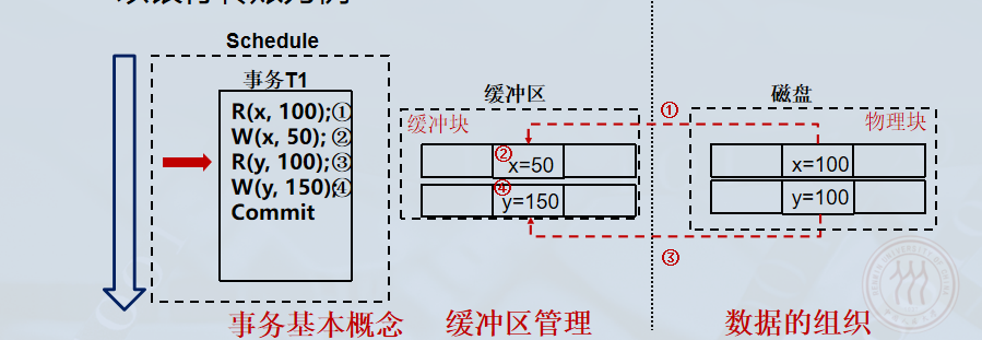 Write(x): 在缓冲区中修改 xxx 的值(例如 100→50100 \to 50100→50),此时缓冲区中的页变为脏页 (Dirty Page) ,但磁盘上仍是旧值。
