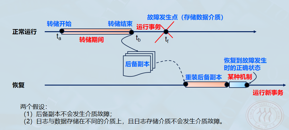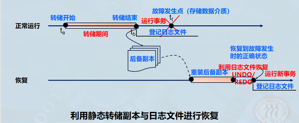 - 要恢复到故障发生时的正确状态,必须结合日志文件,重新运行自转储以后的所有更新事务。