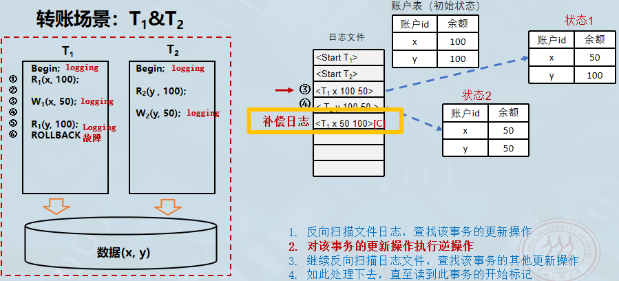 UNDO-LIST中的每个事务执行 UNDO 操作。 - 对
