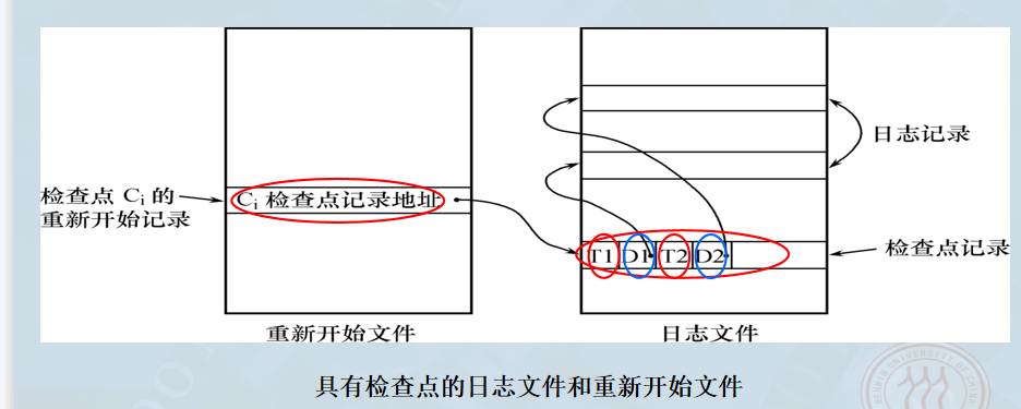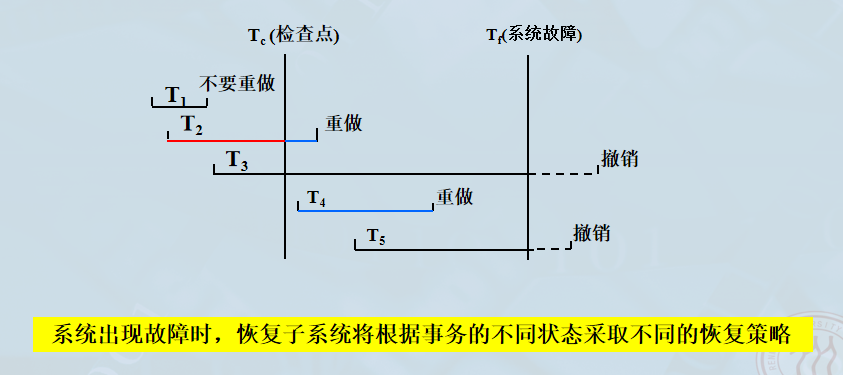 问题:如果在建立检查点过程中(特别是上述4个步骤没执行完时)发生了系统故障,恢复子系统会如何恢复数据库?