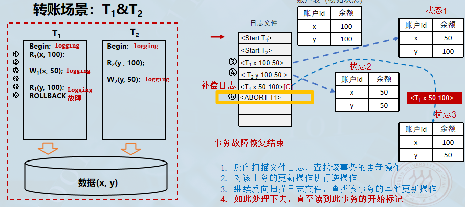 ROLLBACK语句,撤销已做的修改,将数据库恢复到正确状态。 - 示例: 银行转账中,如果账户 xxx 余额不足(