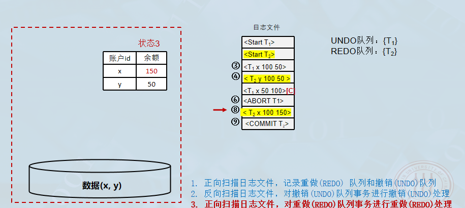 - 难点:日志文件的使用规则(先写日志后写数据库)、系统故障恢复中队列的构建(UNDO队列 vs REDO队列)。