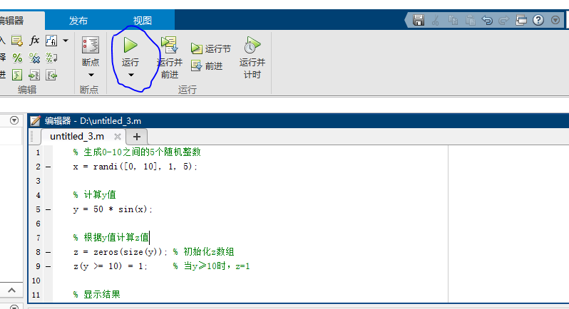 y=50*sin(x),x为0-10之间随机产生的5个整数,当y<10时,z=0,当y≥10时,z=1,进行matlab代码编写