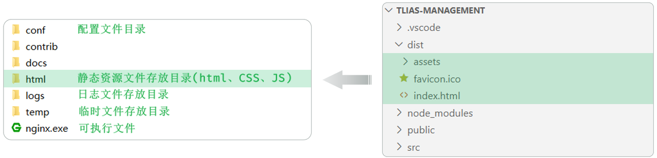 然后直接将 dist 目录中的内容,拷贝到nginx的解压目录中的 html 中即可 (html目录下原有的两个文件, 可以直接删除)。