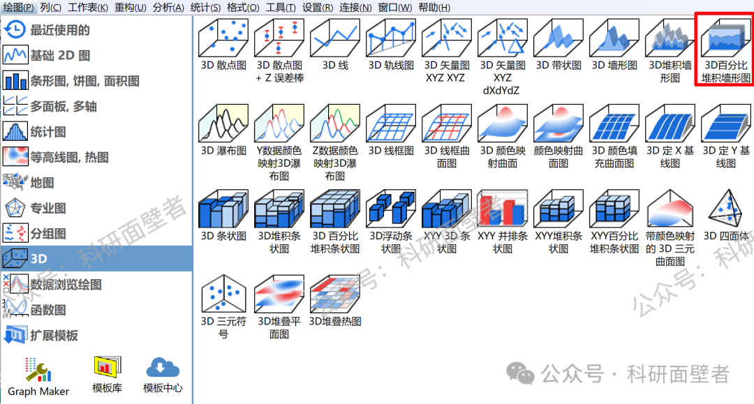 选中所有要绘图的列数据,依次点击绘图、3D、3D百分比堆积墙形图: