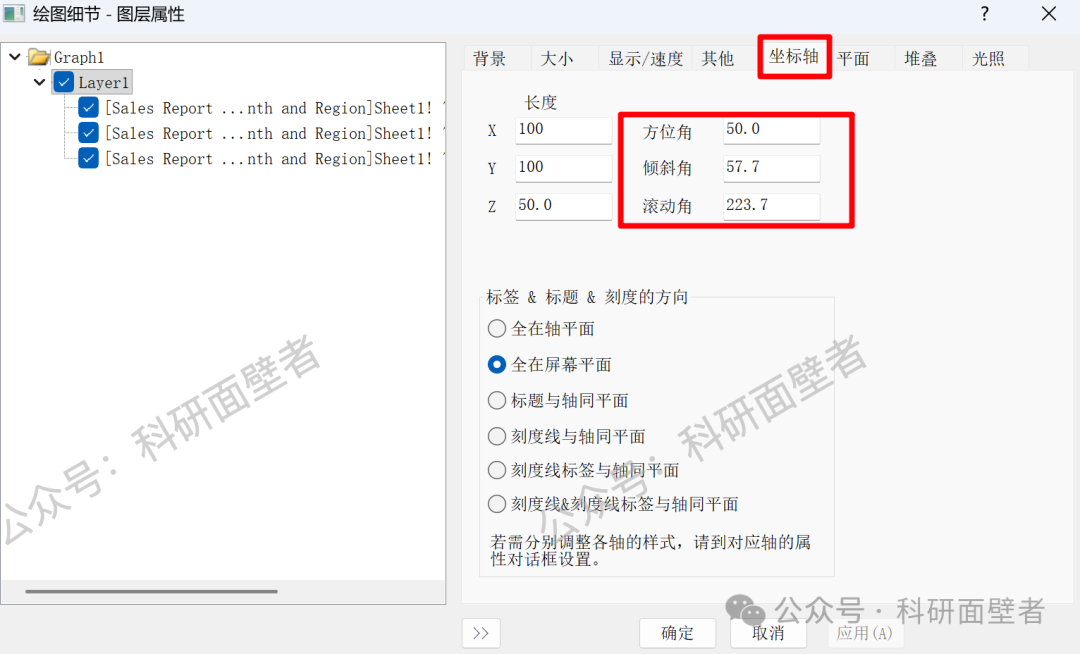 坐标轴菜单,可以按需选择标签、标签和刻度的显示方向,如修改为选择全在屏幕平面: