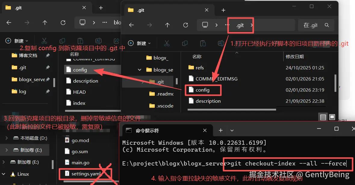 后续在其他地方拉取项目,只需把原项目的 .git/config 文件复制过去,删除要复原的「需脱敏文件」(如之前的 settings.yaml),再执行 git checkout-index --all --force 就能恢复本地配置。
