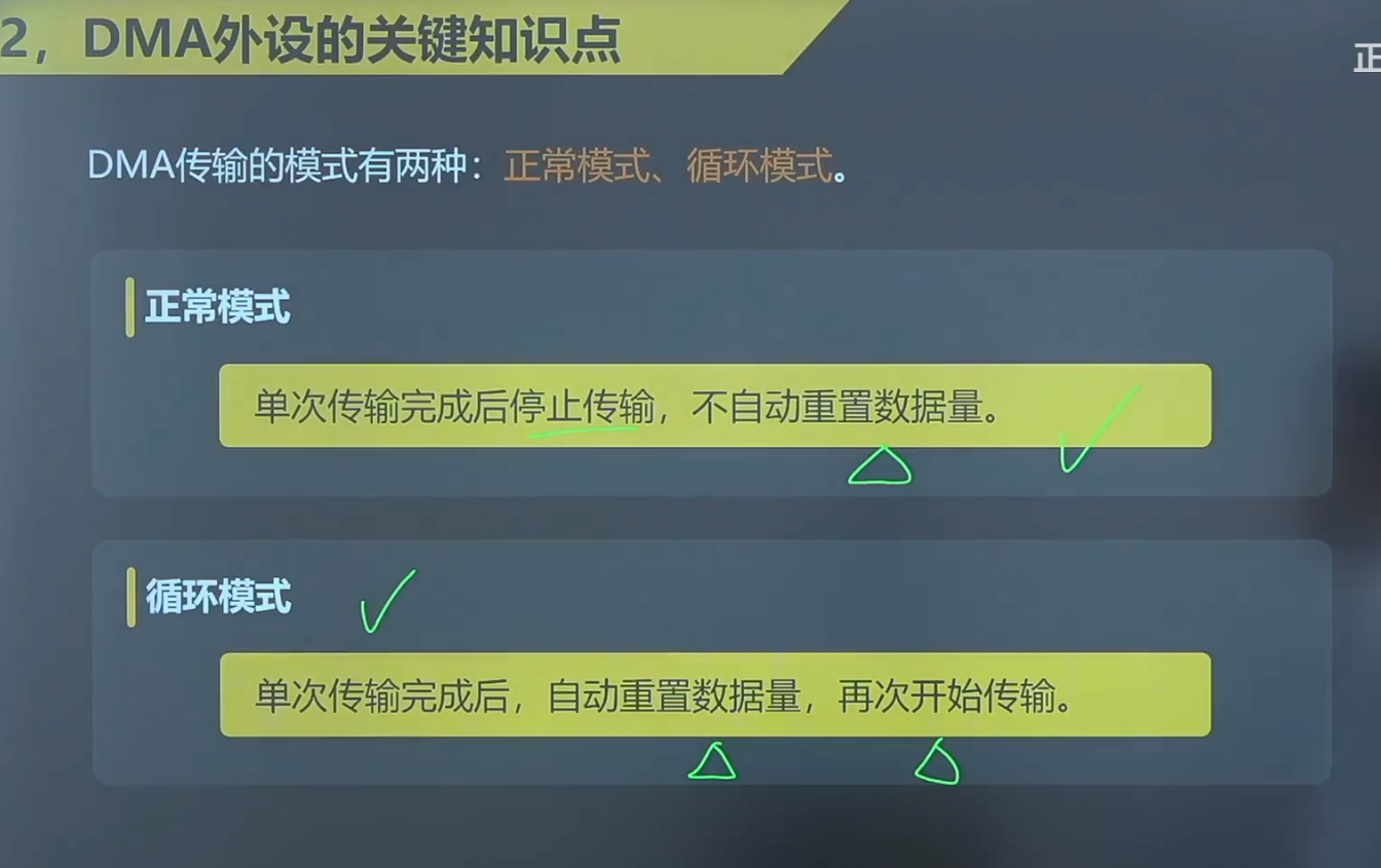 需要先停止 DMA,再重新启动 :正常模式下,一次 DMA 传输完成后,DMA 通道会自动关闭(