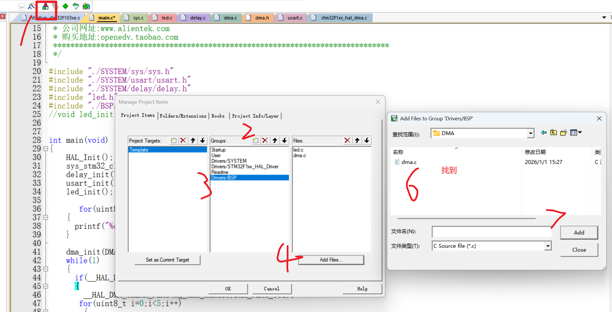 注释:由于创建了dma文件存储dma.c和dma.h用来存储dma的初始化信息等,定义了变量buf_a和buf_b变量和句柄需g_dma_handle将其定义为全局变量方法如下(全局变量定义方法:)