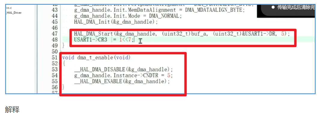 (2)上述两个方框的内容可以使用方法二中介绍的HAL_UART_Transmit_DMA()函数代替。