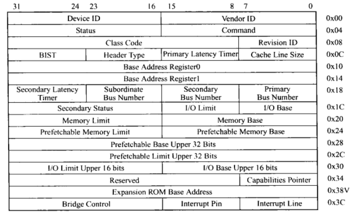 PCI桥的配置空间。与PCI设备不同的是,PCI桥只有两个BAR寄存器。secondary bus相关的寄存器;总线IO和存储器地址空间, IO/MEMORY BASE/LIMIT。可预读空间和不可预读空间,prefetchbale memory。