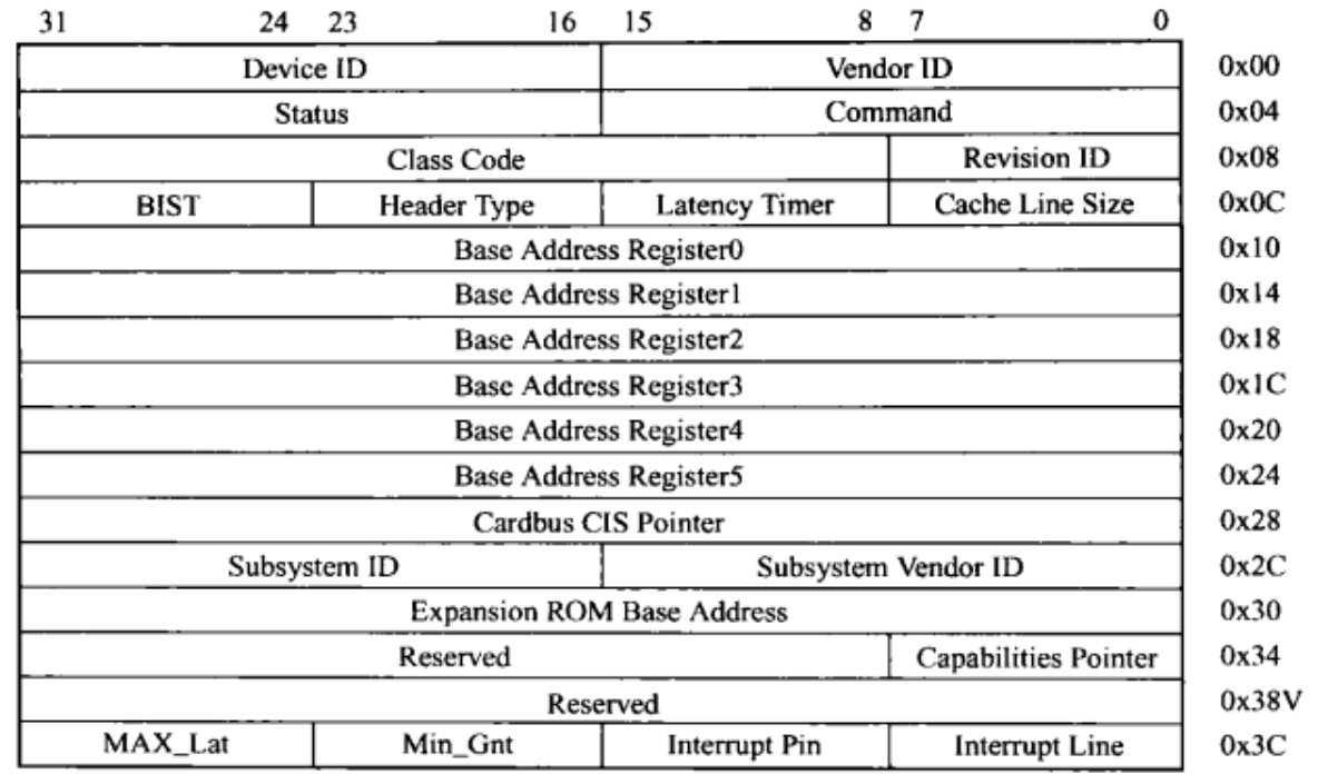 PCI设备配置空间,class id将PCI设备分类为显卡、网卡、pci桥等等。 header表明这个设备的类型是多功能设备还是单功能设备;以及配置空间的类型。interrupt line寄存器是软件配置时写入的,记录PCI设备使用的中断向量号。BAR0-5寄存器保存PCI设备使用的PCI总线空间内的基地址和大小。