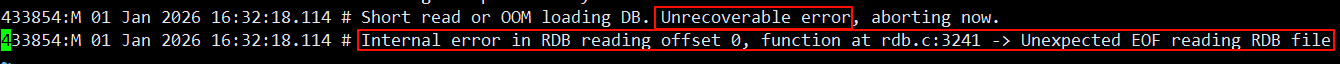 可以看到是因为恢复数据过程中,rdb文件读取错误。
