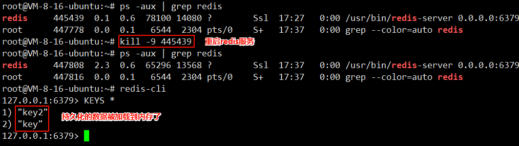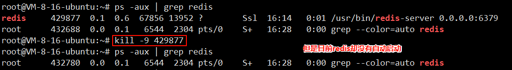 由于是由service启动的redis,ubuntu会有守护进程观察redis服务的情况,如果redis挂了,就会自动拉起一个新的。这里的进程id并不相同,也就是redis进行了重启过了