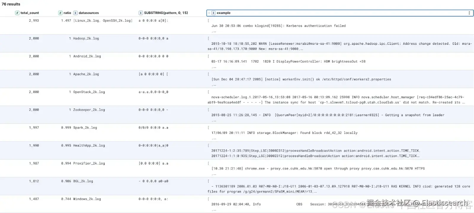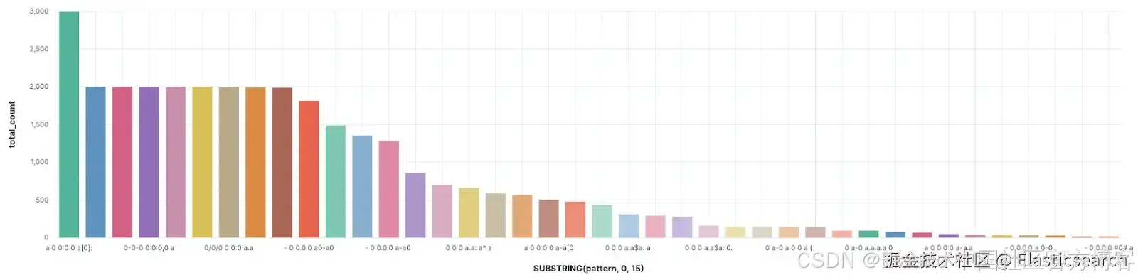 3. STATS total_count = COUNT(), ratio = COUNT() / 2000.0, datasources=VALUES(filename), example=TOP(raw_message, 3, "desc") BY SUBSTRING(pattern, 0, 15) |
