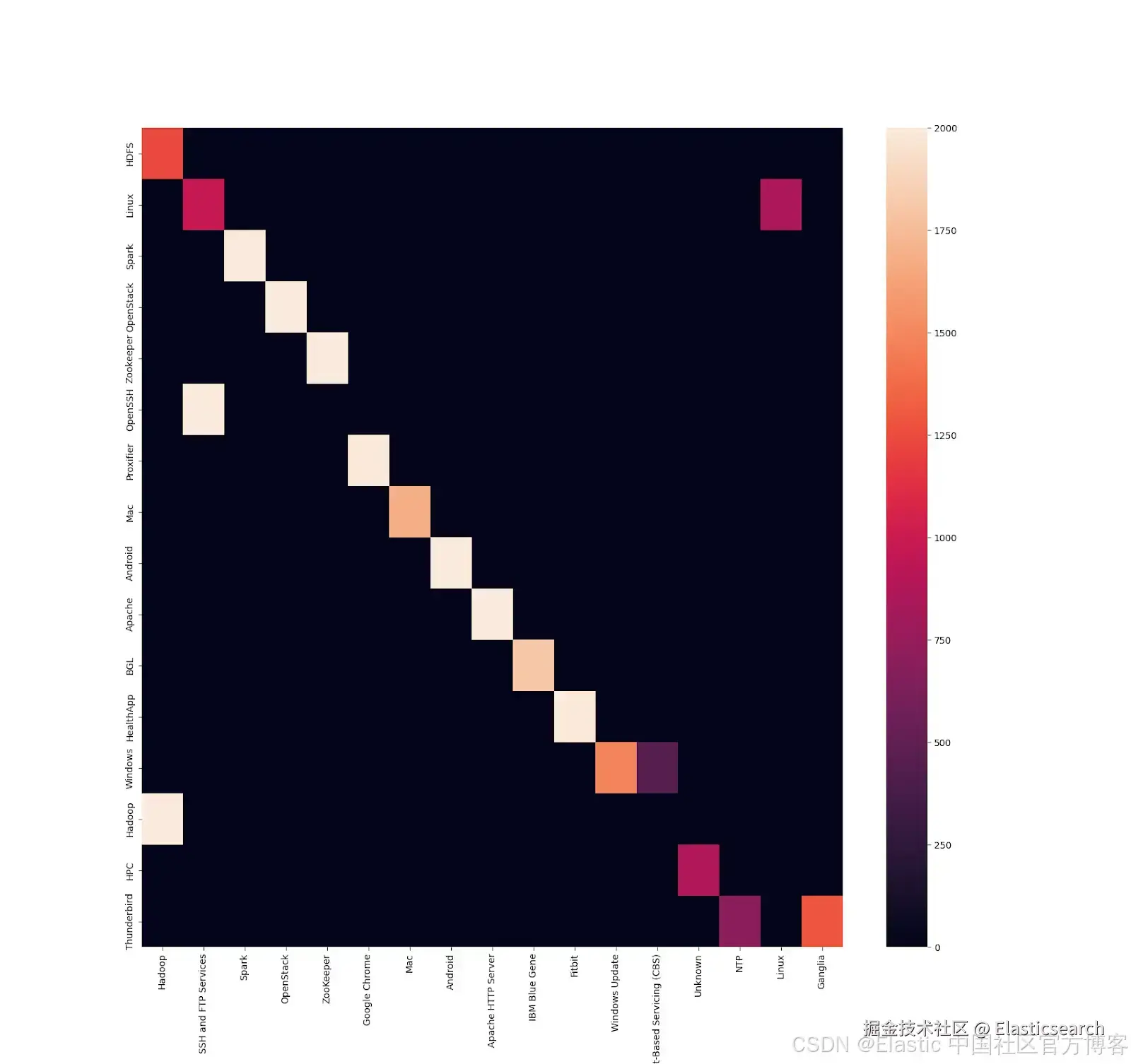 上图的混淆矩阵展示了日志分区结果。纵轴表示实际数据源,横轴表示预测数据源。热力图的颜色深浅对应日志数量,颜色越浅表示数量越多。对角线的对齐显示模型在源归属上的高准确性,散布最小。