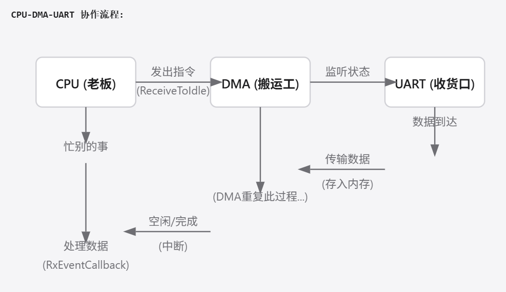 它的指令更复杂:"嘿,DMA 搬运工 (已通过 `huart` 句柄关联好),你现在去串口收货口 (`huart->Instance`) 守着。一旦有货 (`数据字节`) 进来,你就用你专属的通道,直接把它搬到仓库的这个临时区域 (`pData`)。这个区域总共能放 `Size` 件货。你一直搬,同时注意听着收货口的动静,如果突然安静了超过一个字节的时间(总线空闲,IDLE 事件),或者你把这个临时区域 (`pData` 指向的内存,大小为 `Size`) 给堆满了 (DMA TC 事件),都要立刻通过内部专线(中断)向我(CPU)汇报!"