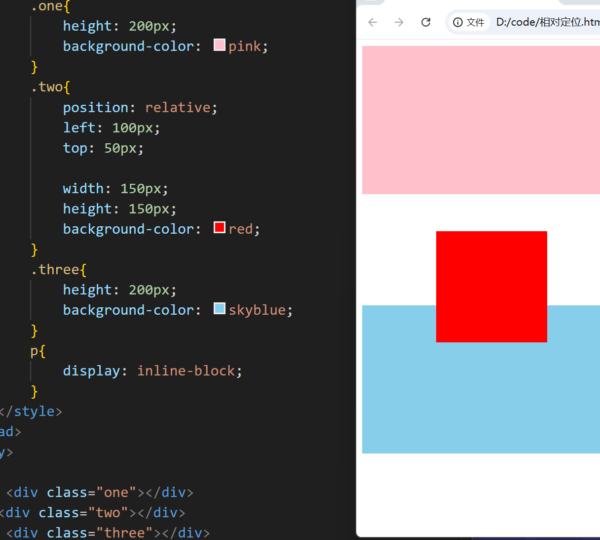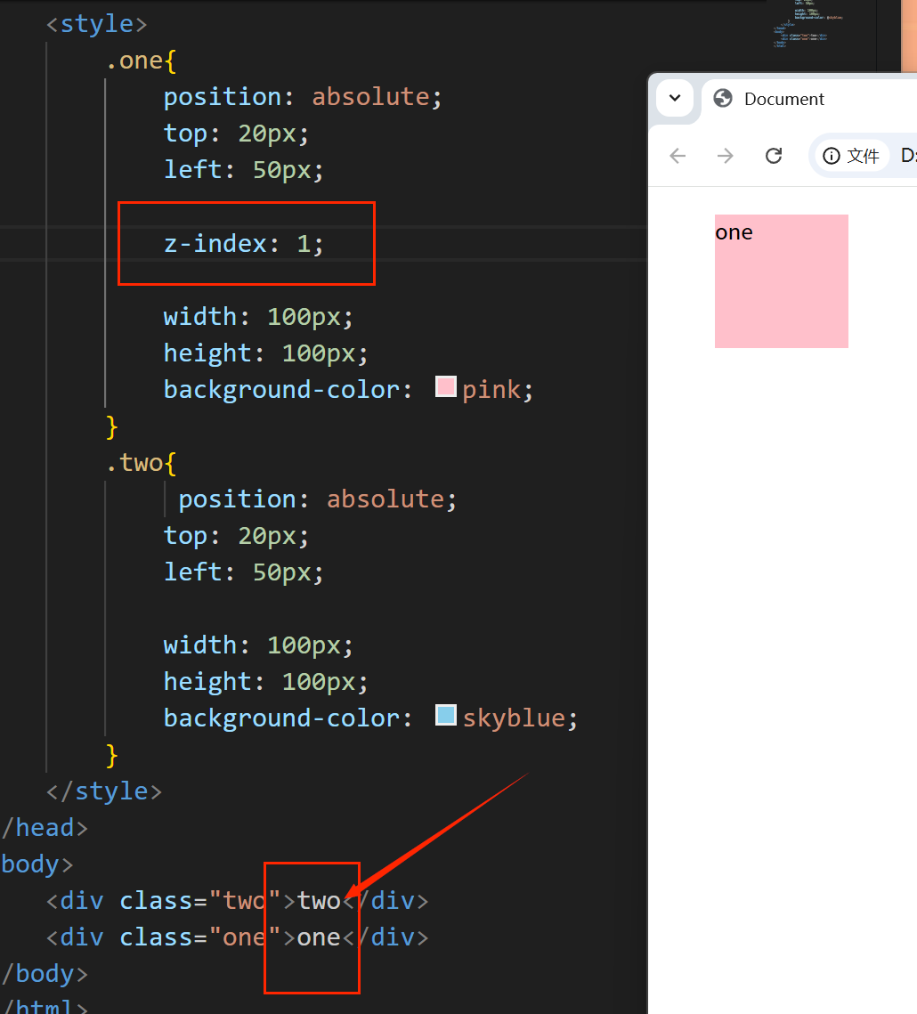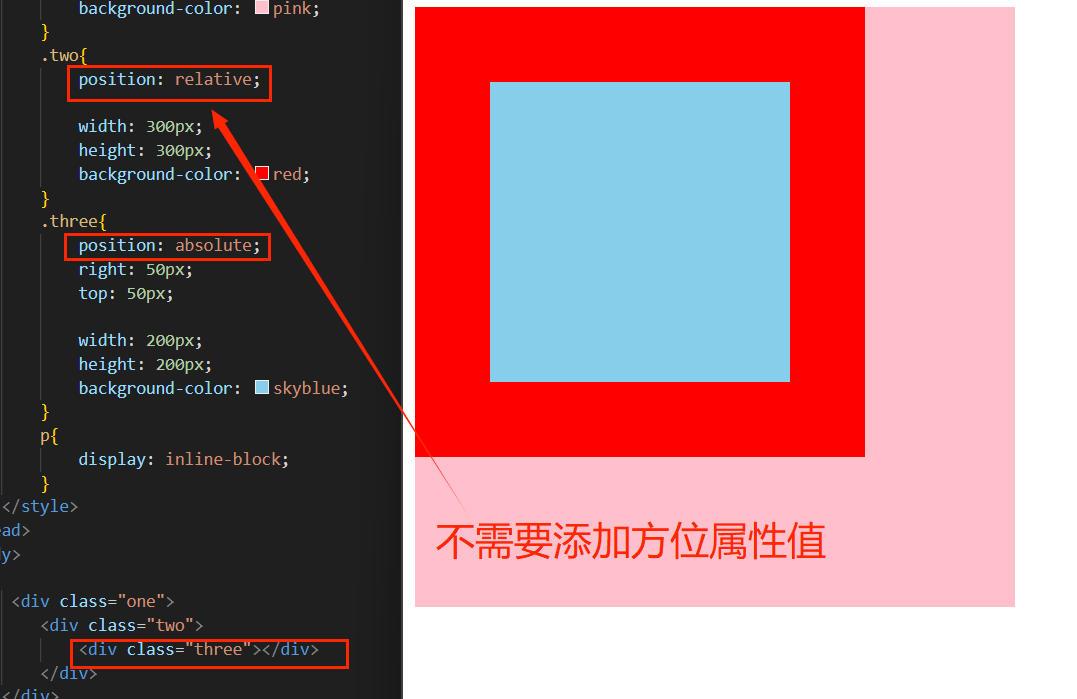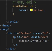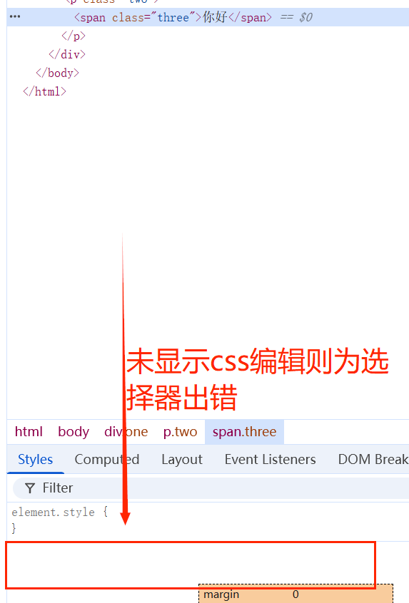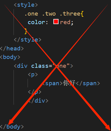 选择器中由三个类选择器组成,应分别对应三个嵌套关系中的每一个标签,但p和span并未设置对应选择器,所以最终文字并不会显示红色,若想显示1)补全类选择器;2)将选择器改为.one p span