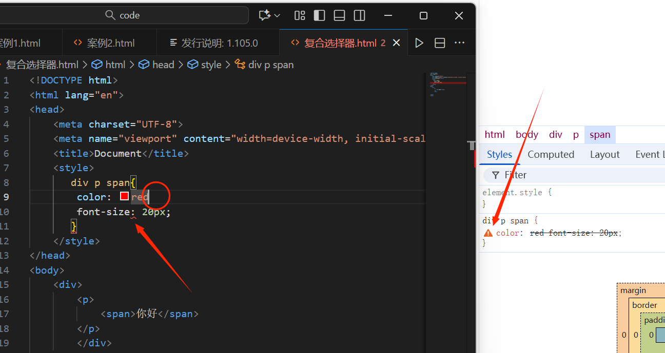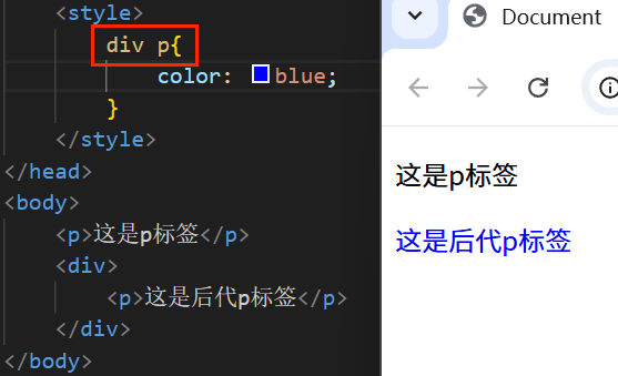 结构:选择器1 选择器2{css}(两个标签之间用空格隔开)