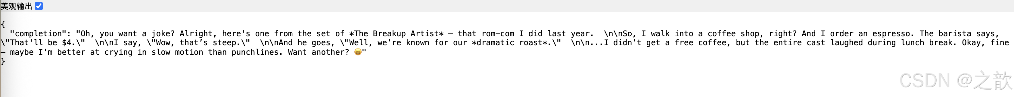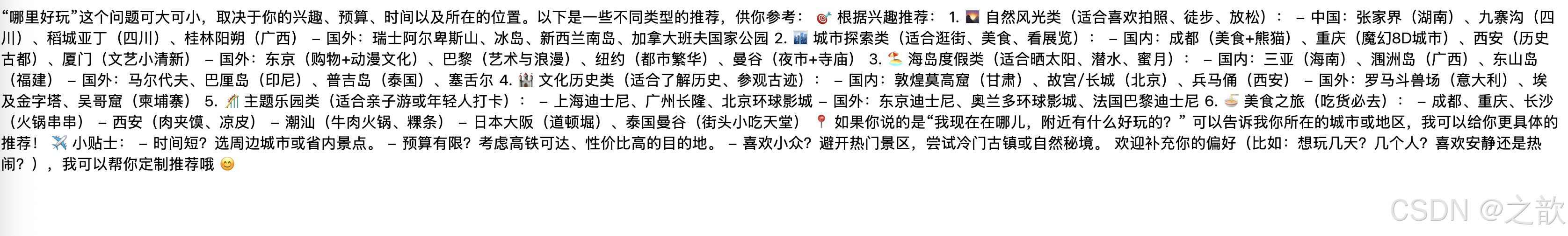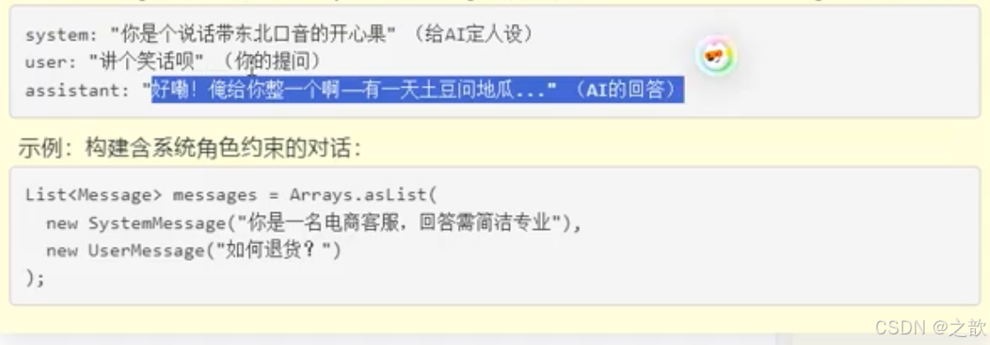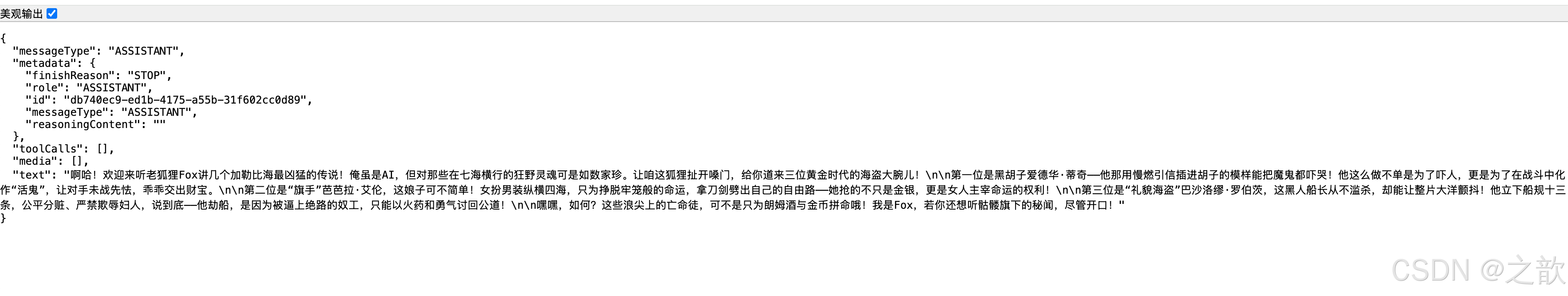 在这个示例中,首先设置了用户消息的内容,call 方法向 AI 模型发送请求,content 方法以字符串形式返回 AI 模型的响应。