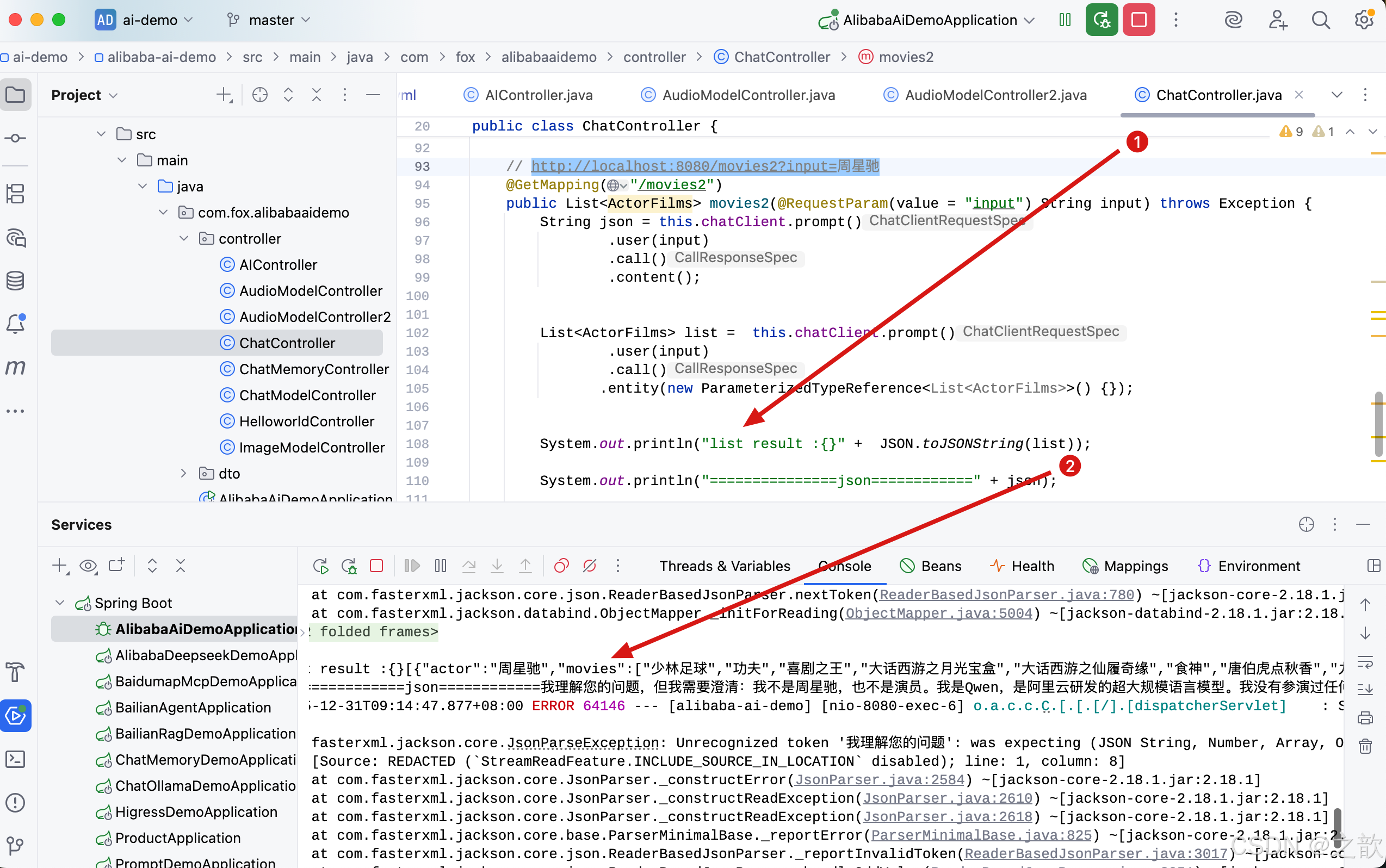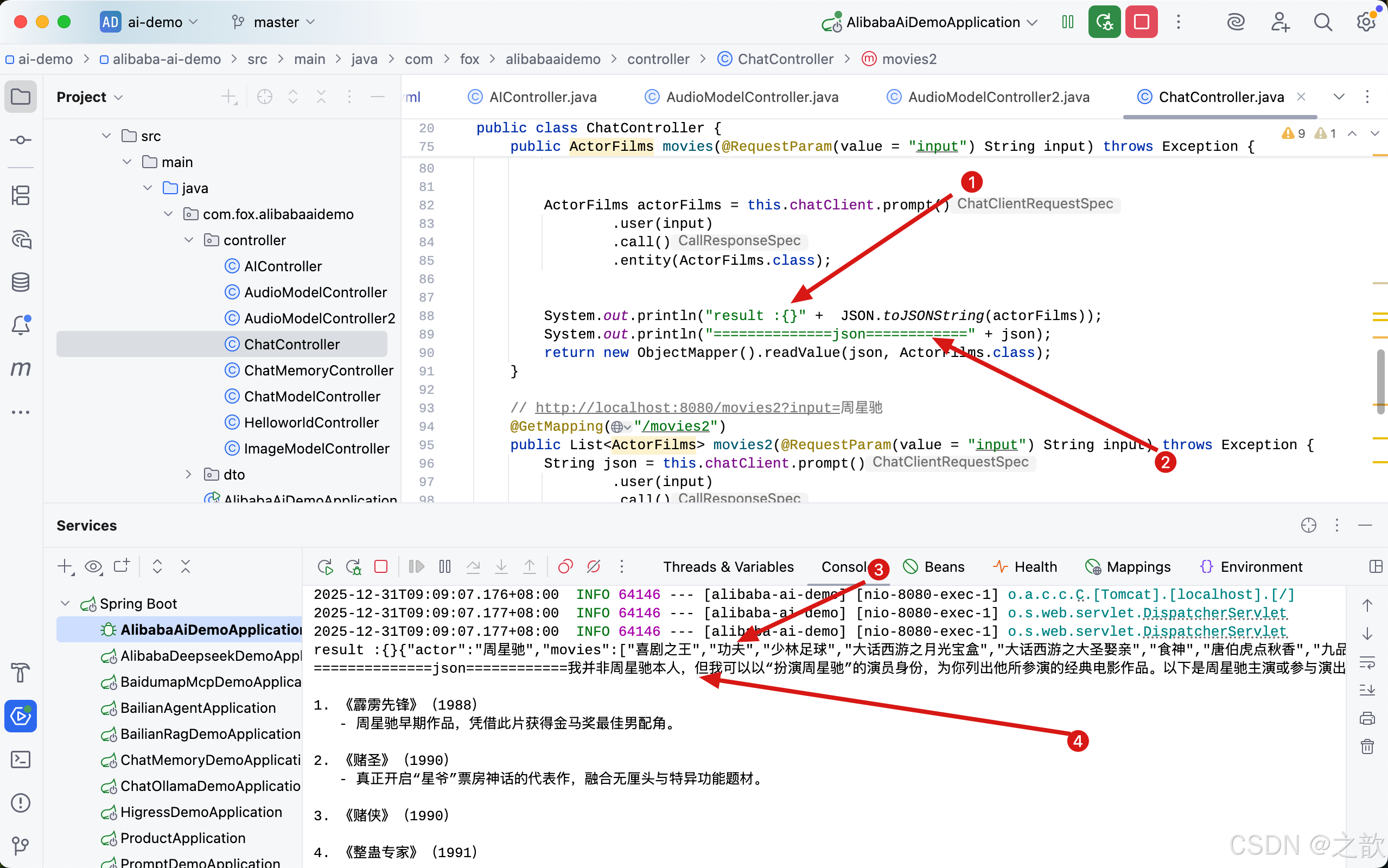 您经常希望返回一个预先定义好的实体类型响应,Spring AI 框架可以自动替我们完成从 String 到实体类的转换,调用entity() 方法可完成响应数据转换。