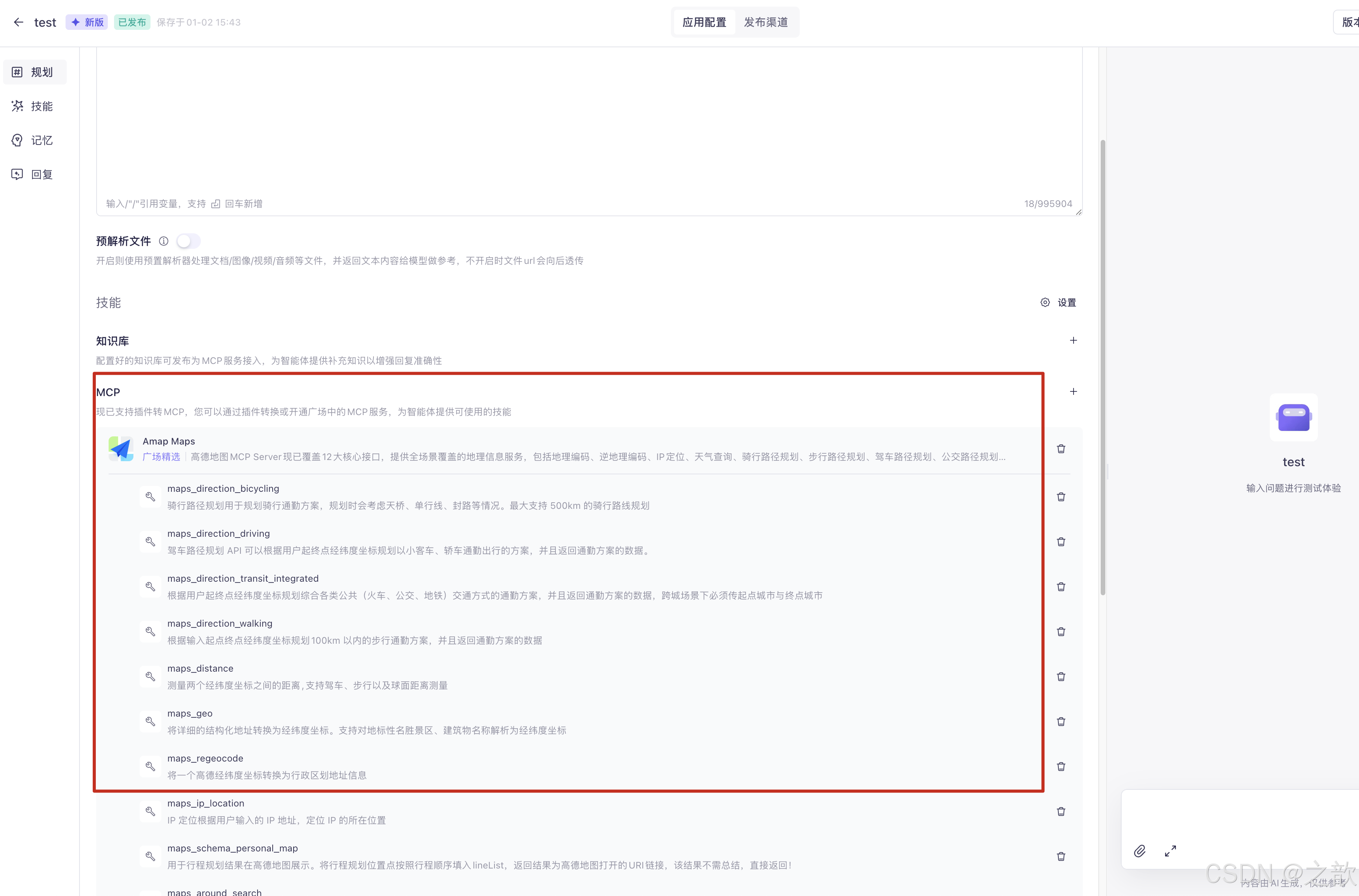 选中 Amap Maps , 点击立即开通 ,同时将mcp 服务添加到应用中来。